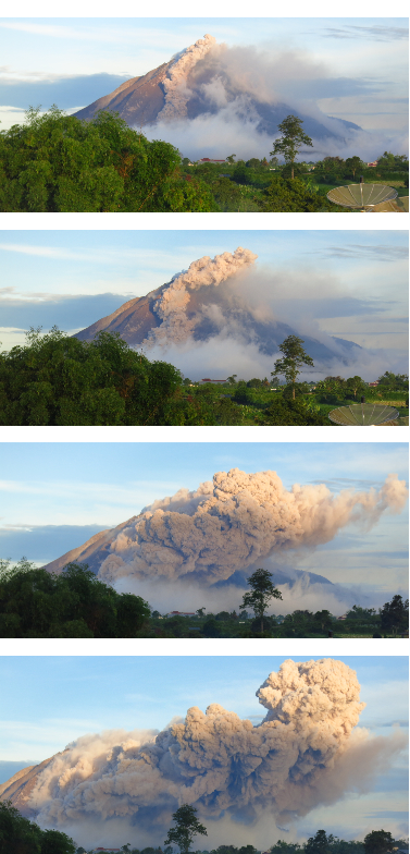 The next morning, I woke up around seven and went to the roof to take a picture of the other, much more active volcano, Mount Sinabung. It wasn't more than a minute after arriving that the volcano started erupting! I was in awe. A huge plume of smoke and ash rolled down the side, then simply grew and grew until the wind stretched it across the otherwise clear sky. Stunning.